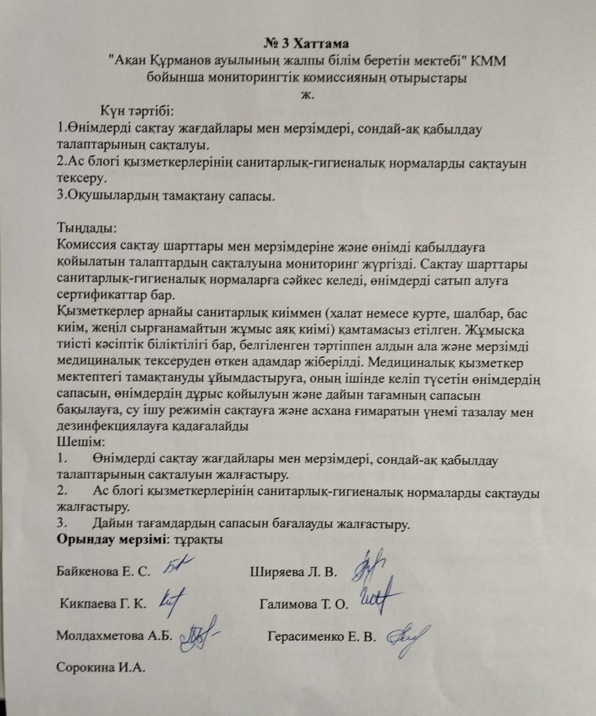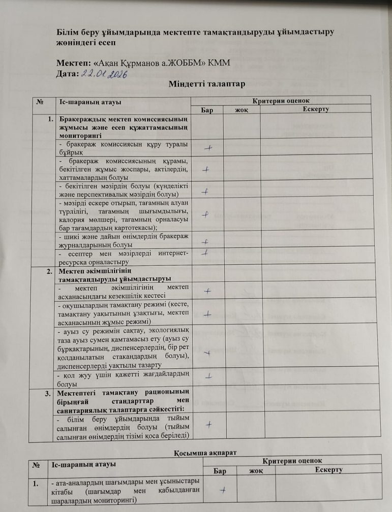 2026 жылғы 22 қаңтарда мектептегі тамақтану мониторингі комиссиясы сақтау шарттары мен мерзімдеріне қойылатын талаптарды сақтау, өнімді қабылдау, тамақ дайындау технологиясын сақтау, мектеп асханасының санитарлық жағдайы бойынша мектеп асханасына мониторинг жүргізді.