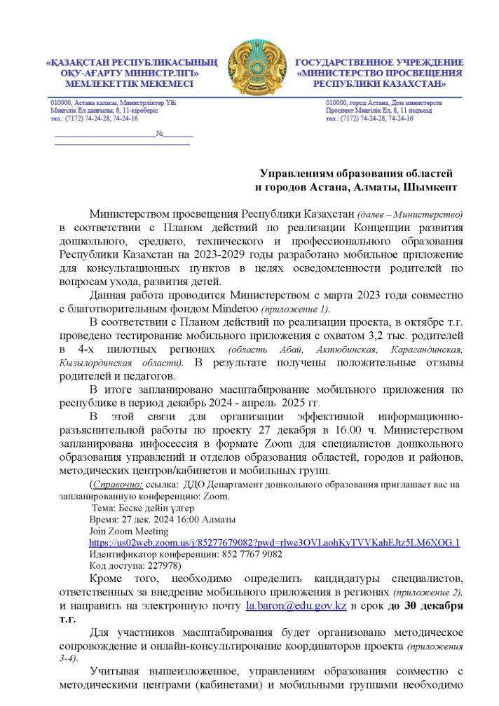 Управлениям образования областей и городов Астана, Алматы, Шымкент.