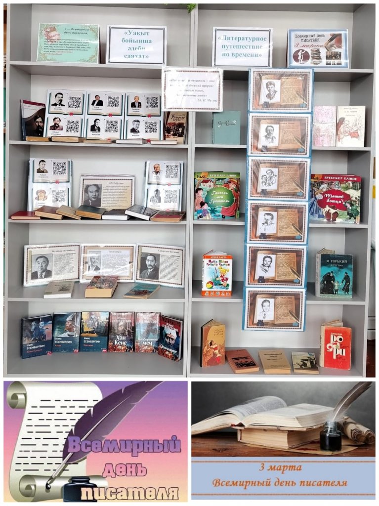3 наурыз – Дүниежүзілік жазушылар күніне орай Ақан Құрманов ауылының мектеп кітапханасында «Уақыттағы әдеби саяхат» атты көрме-шолу ұйымдастырылды.