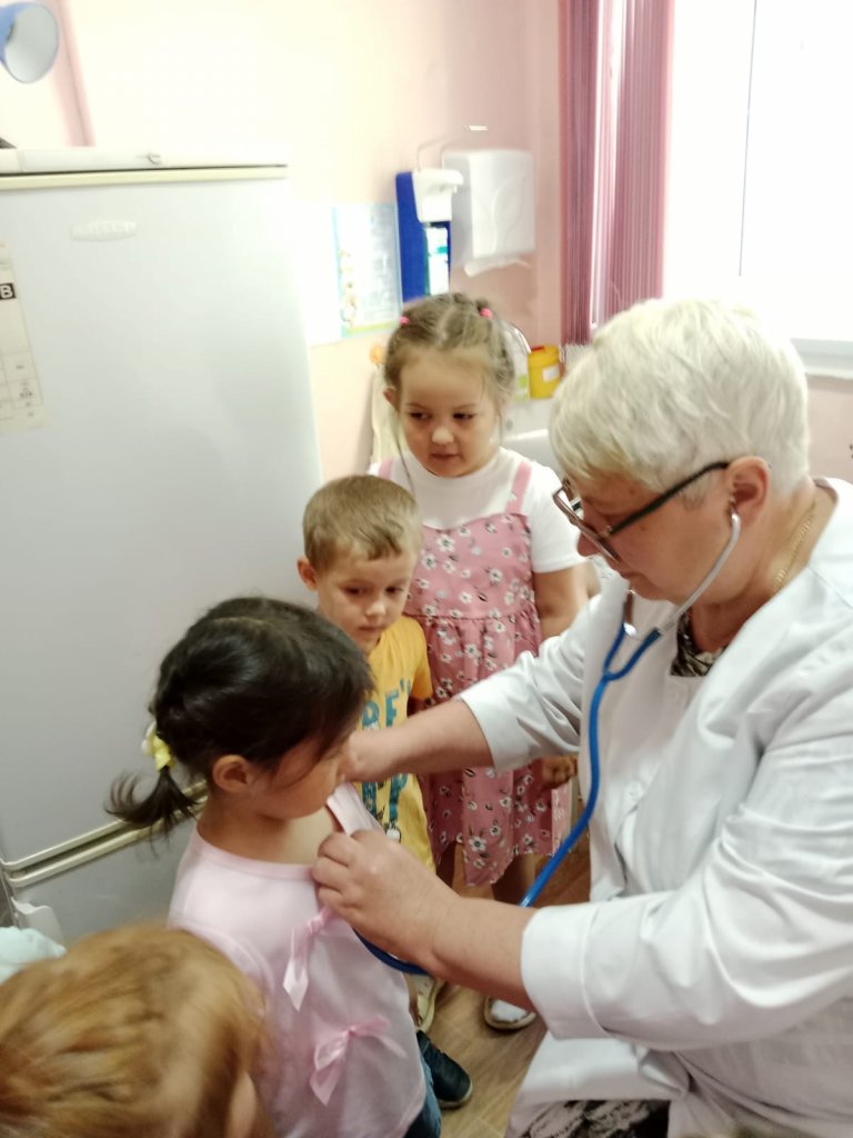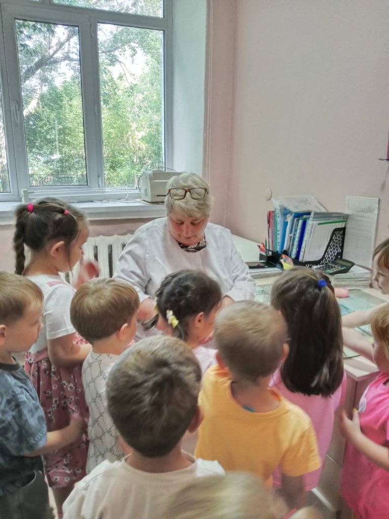 Таңертең балалар медицина қызметкері Ширяева Л.В.-ның жұмыс орнына, медициналық кабинетке экскурсияға барды. Людмила Владимировна балаларды жылы жүзбен қарсы алып, өз жұмыс орнымен таныстырды, өзінің қызметі, балаларды күнделікті қабылдауы туралы айтып берді.