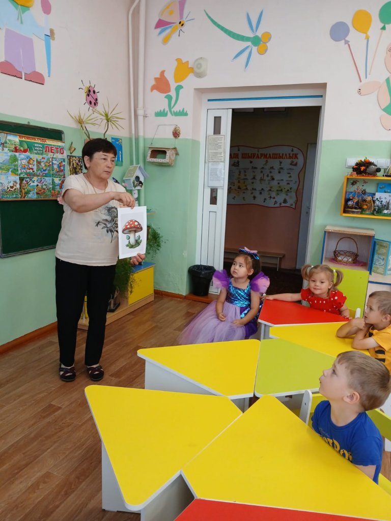Сабақтың мақсаты балаларда жарамды және жарамсыз саңырауқұлақтар туралы түсінік қалыптастыру, оларды сыртқы белгілеріне қарап ажырата білуге үйрету және ең көп тараған саңырауқұлақтардың (ақ саңырауқұлақ, лисички, мухомор, ақсүйек саңырауқұлақ) атауларын бекіту болды.