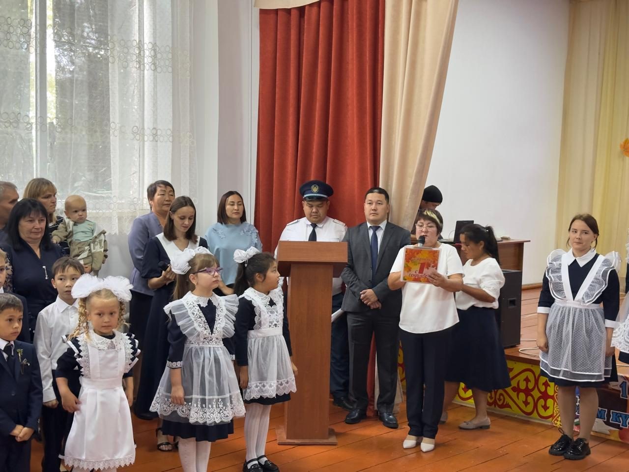Салтанатты жиында ата-аналар мен оқушыларды құттықтау сөздерімен Атбасар ауданы әкімінің орынбасары Бегалинов А.М., ауылдық округ әкімі Белялова А.Д., мектеп директоры Қостұбаева Д.Б., Атбасар ауданы полиция бөлімі жергілікті полиция қызметінің аға уәкілі, полиция майоры Жакишев А.М. сөз сөйледі.
